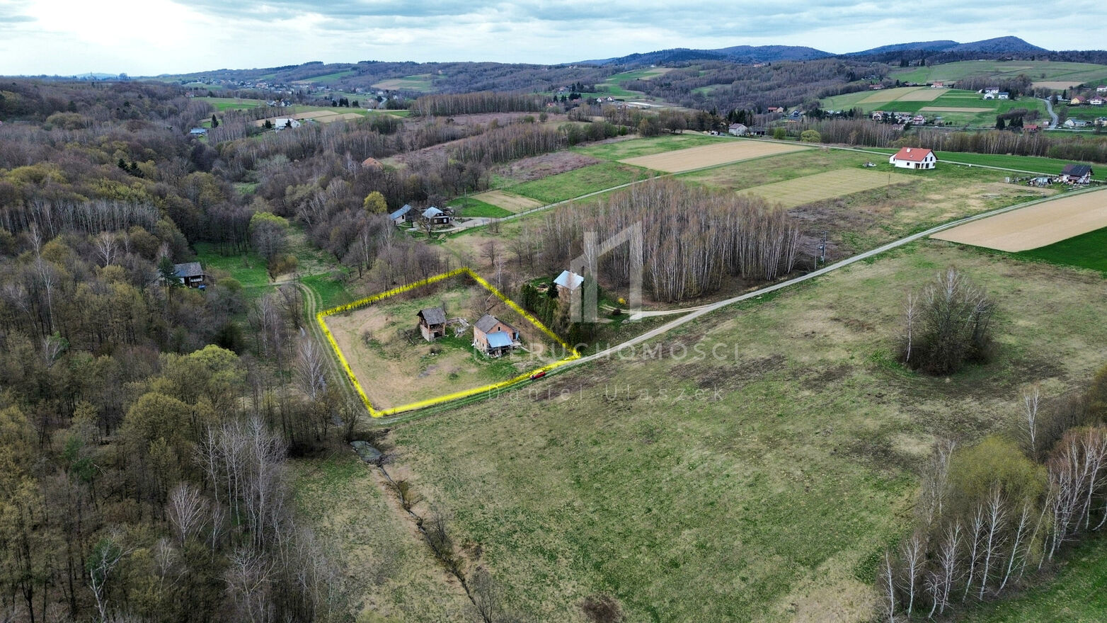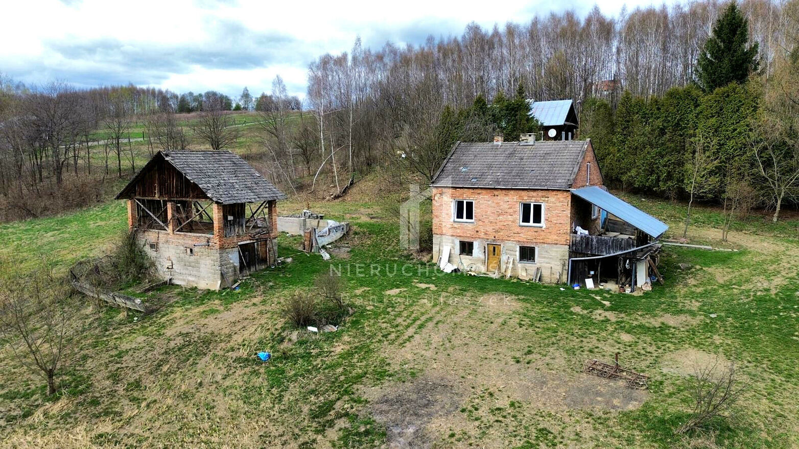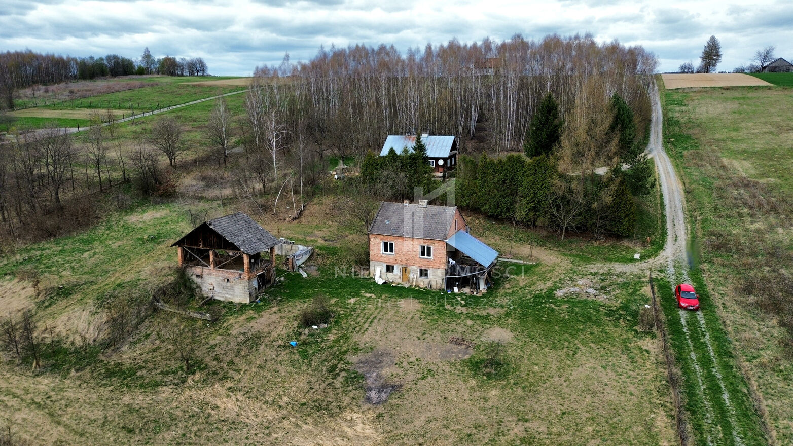 - Na działce znajduje się budynek gospodarczy, który można poddać odbudowie lub rozbiórce, a także pozostają fundamenty po drugim budynku.